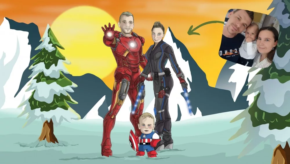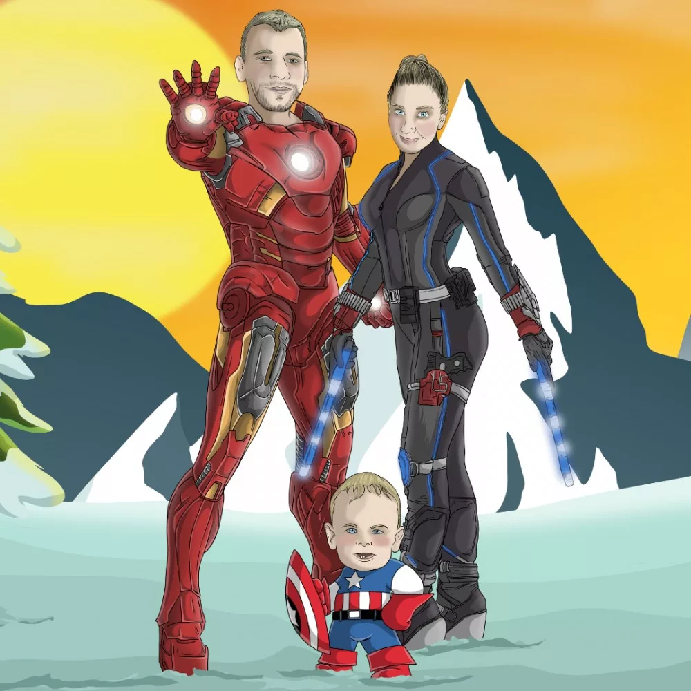 Igen erre is van lehetőség. Példul van egy vicces jelmezes képed apukádról + a te karakteredet pedig a kedvenc filmed egyik jelenete alapján szeretnéd megjeleníteni a portrédon. Ezt a két képet egybe tudom neked varázsolni a portrén.