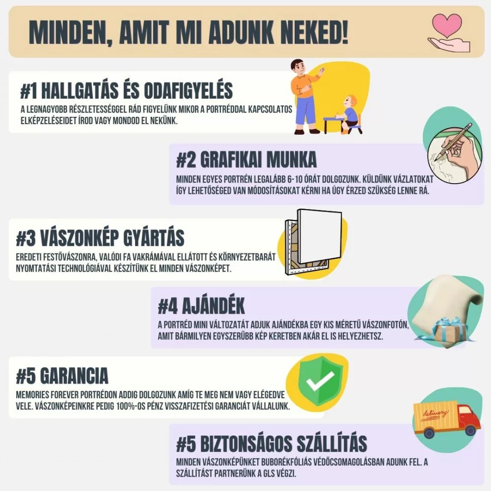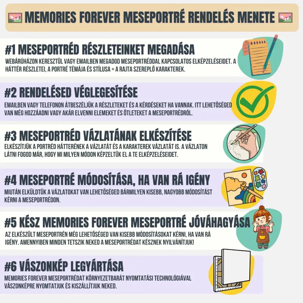 Az általad választott méretű vászonkép valódi fa vakrámával + ajándék akasztóval. A vászonképről bővebben a "Részletek" fül alatt olvashatsz. Minden vászonkép rendelés mellé emailben elküldöm a kész digitális meseportrét is .png fájl formátumban.