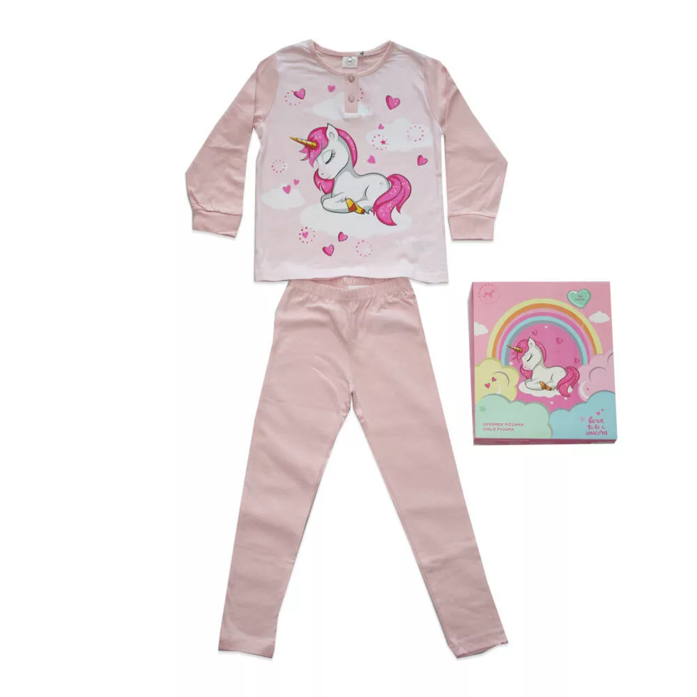Hosszú vékony pamut gyerek pizsama - Unikornis - Jersey - világosrózsaszín - 98