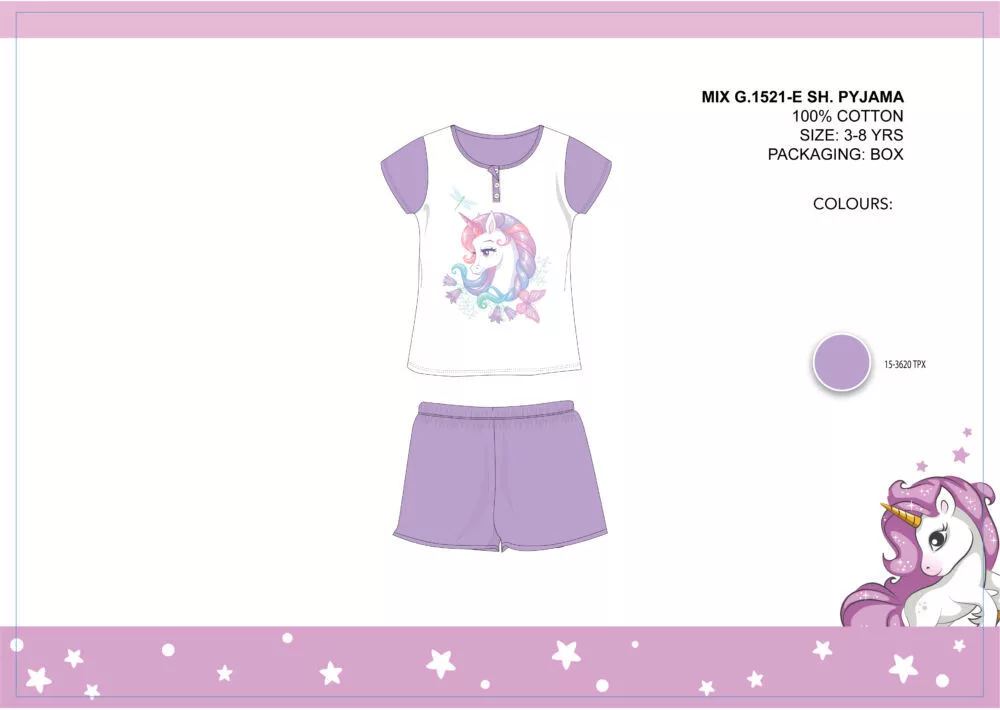Unikornis nyári rövid ujjú gyerek pizsama - pamut pizsama - világoslila - 116